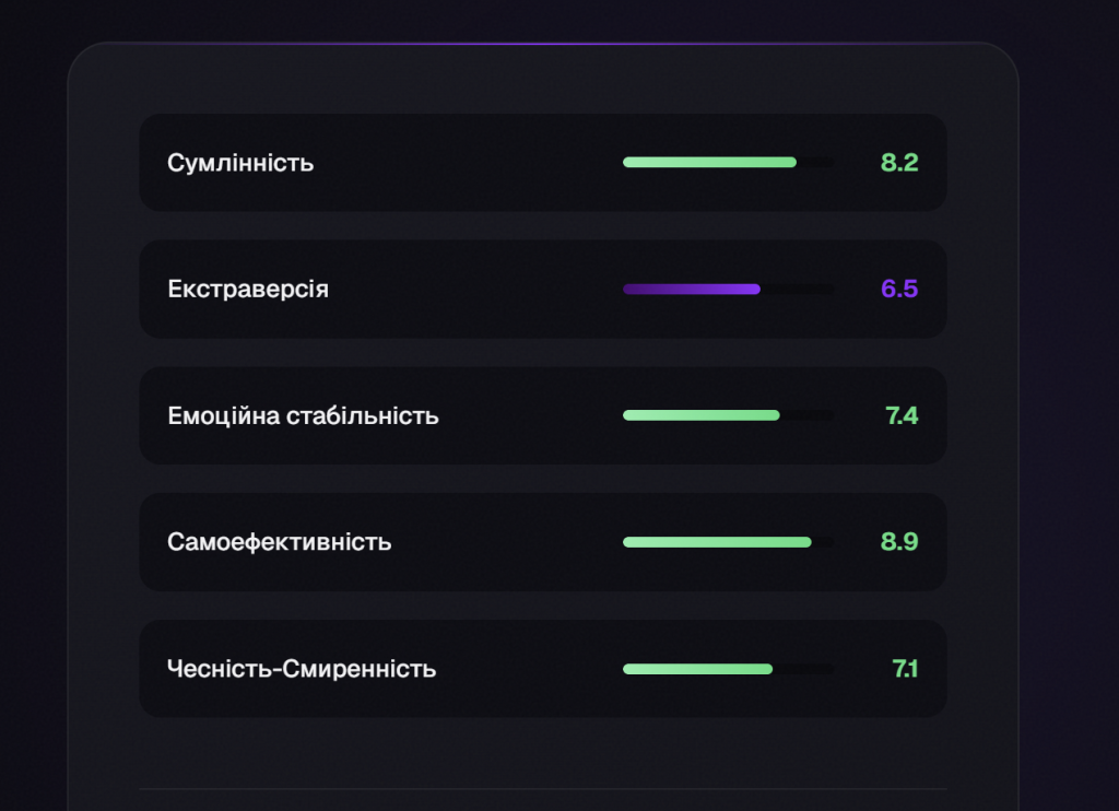 Після аналізу інтерв’ю з фахівцем система формує рекомендації щодо відповідності особистісних рис кандидата вимогам конкретної ролі. Це дозволяє рекрутерам і менеджерам зосередитися на перевірці хард-скілів, досвіду та професійного бекграунду.